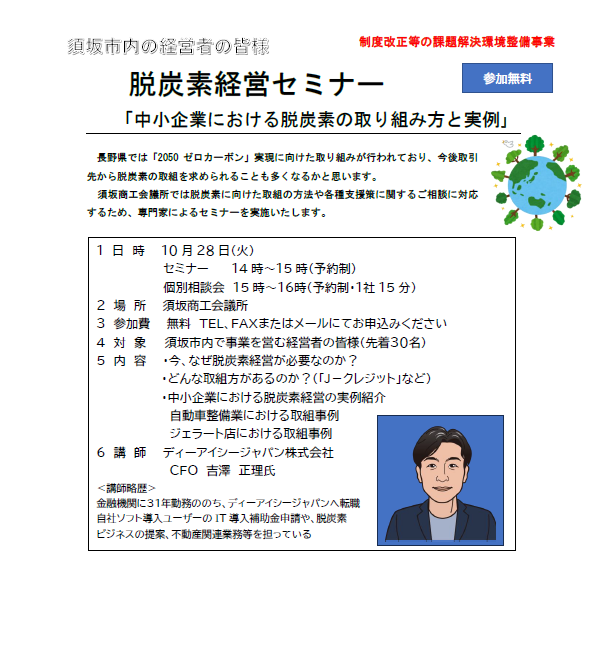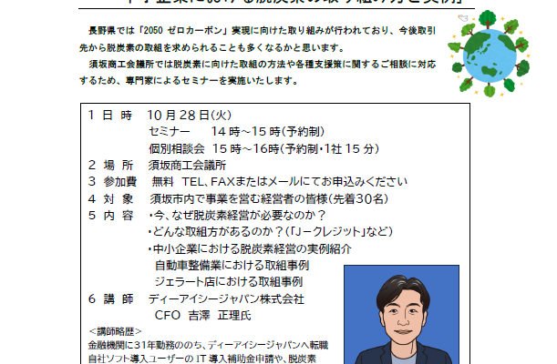 長野県では「2050ゼロカーボン」実現に向けた取り組みが行われており、今後取引先から脱炭素の取組を求められることも多くなるかと思います。須坂商工会議所では脱炭素に向けた取組の方法や各種支援策に関するご相談に対応するため、専門家によるセミナーを実施いたします。