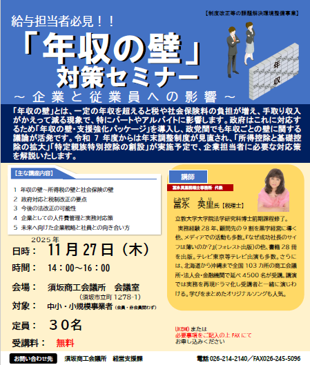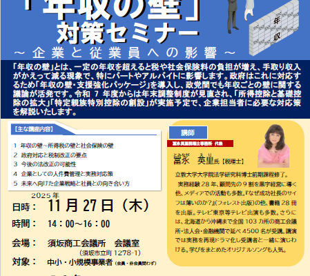 令和7年度から「年収の壁」対策として年末調整制度が見直されます。年末調整事務にあたって制度の変更点の再確認のためのセミナーを開催します。